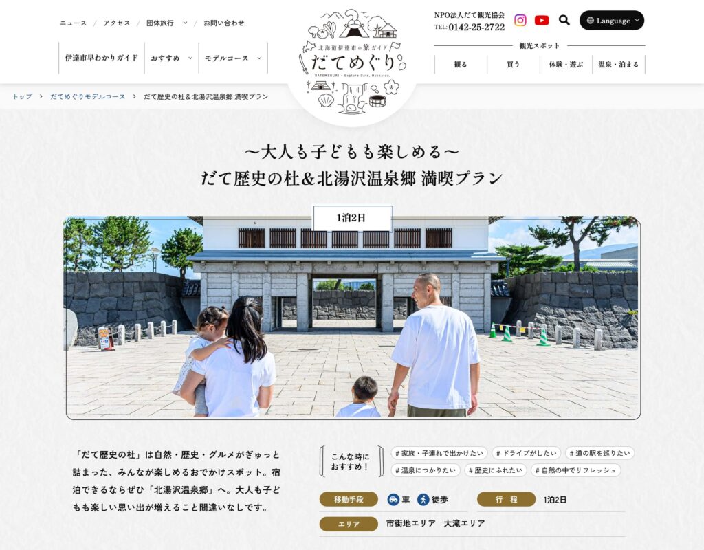 モデルコースでは、家族旅行や女子旅、歴史散策など、目的別に伊達市の楽しみ方を紹介。